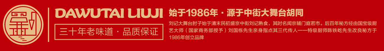 盛京,昔乃大清王朝發(fā)祥之地。劉記大舞臺肘子始于清末民初盛京中街劉記熟食,其時名聞京輔門庭若市。后百年秘方經(jīng)由國寶級廚藝大師(國家商務(wù)部授予)劉國棟先生親身指點(diǎn)其三代傳人——中國烹飪大師劉家驥之徒中國烹飪大師陳鐵屹先生改良秘方,于1986年創(chuàng)立品牌。劉記大舞臺經(jīng)營的產(chǎn)品涵蓋招牌熏肘,豬蹄,燒雞等系列,產(chǎn)品色澤潤嫩、酥美可口、吮指尤香、譽(yù)滿沈城,遂成古今絕味,其獨(dú)特的風(fēng)味深受沈城百姓喜愛。經(jīng)過三十余年的沉淀發(fā)展,劉記大舞臺品牌也成為了沈陽地標(biāo)美食文化名片之一。